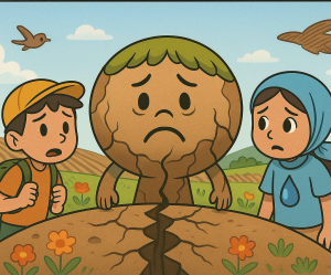 – «بله. این اسمش فرونشسته. وقتی آبهای زیرزمینی تموم میشن، من دیگه نمیتونم خودمو نگه دارم و هی فرو می ریزم. کاشتن محصولات پرآب مثل خربزه و خیار و سیب، یونجه و چغندر و در این وسعت زیاد توی این شرایط خیلی بده. بعضیها خیلی بی انصافند. فکر می کنن مالک آبهای من هستند. حتی با آبهای من برنج می کارند. تازه فقط برنج نیست که بعضیا با آبهای من صدها گاو پرورش می دهند که خیلی مصرف آب زیادی داره. شما بچه ها بایدکاری کنید که بتونید در من که سرزمین شما هستم زندگی کنید. باید به مردم بگید که من دارم فرو می ریزم. باید روشهای اشتباه را کنار بگذارند. روش کاشتشون را عوض کنند، آب را درست مصرف کنن و محصولات کمآب بکارند، وسعت کشت در زمین هاشون را کم کنند. اینقدر حریص نباشند. زندگی همه در خطره. حتی اونایی که زمین ندارند و کشاورز نیستند. حتی شما بچه ها. »