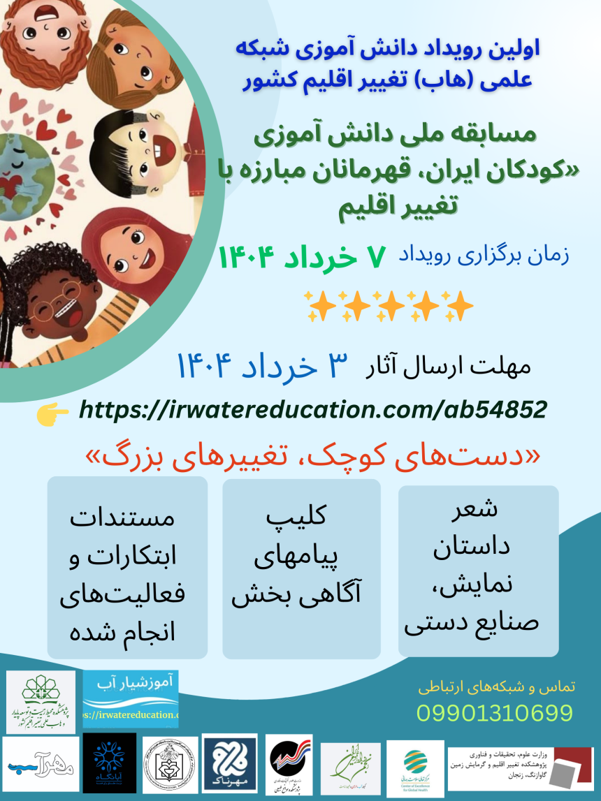 📚 اولین رویداد دانش آموزی شبکه(هاب) علمی تغییر اقلیم کشور در تعامل پژوهشکده محیط زیست و توسعه پایدار با مرکز تعالی سلامت جهانی دانشگاه علوم پزشکی تهران و آموزشیار آب استان بوشهر با شعار *دستهای کوچک، تغییرهای بزرگ* برگزار میگردد :