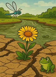 همه مردم نگران بودند. کودکان دیگر شاد نبودند. ابتدا مردم فکر میکردند که جنگ به سرعت تمام خواهد شد. اما جنگ ادامه یافت. ردپای مواد سیاه سوخت تانکها و باروت و فلزات سلاح همه جا روی خاک پیدا بود. مایعات تیرهای بدبود به رودخانه میریختند. دود مواد شیمیایی آسمان را سیاه کرد. رودخانه درخشان تغییر کرد. گلها پژمرده شدند، علفها خشکیدند و آب آلوده باعث شد کم کم ماهیها هم بمیرند، سپس قورباغهها ناپدید شدند. پرندگان نیامدند. به بچهها گفته شد که به آب نزدیک نشوند زیرا دیگر آب برای شنا آلوده بود و روی یک تابلو نوشتند: «به آب دست نزنید. اینجا امن نیست.»
