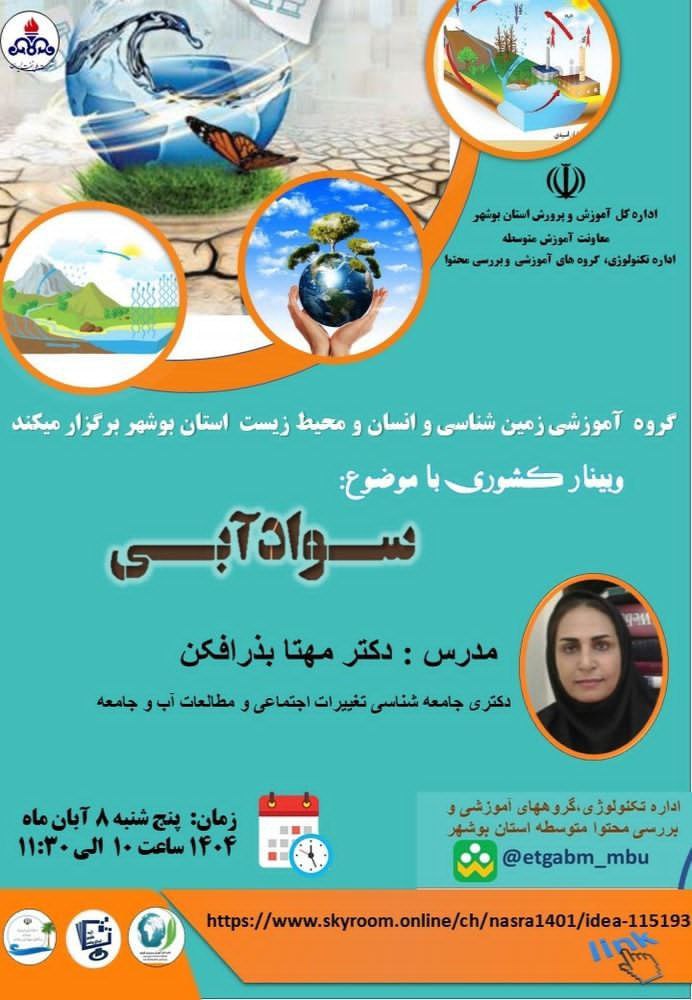 گروه آموزشی زمین شناسی و انسان و محیط زیست متوسطه دوم استان بوشهر با همکاری اداره تکنولوژی، گروه های آموزشی و بررسی محتوای متوسطه استان برگزار می کند: